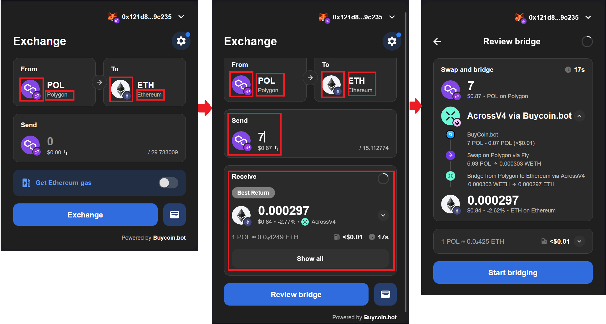 Review cross-chain swap details: fro / to chain , tokens, respective amounts, total fees and price impact. Next, you just need to click on the button to start the process.