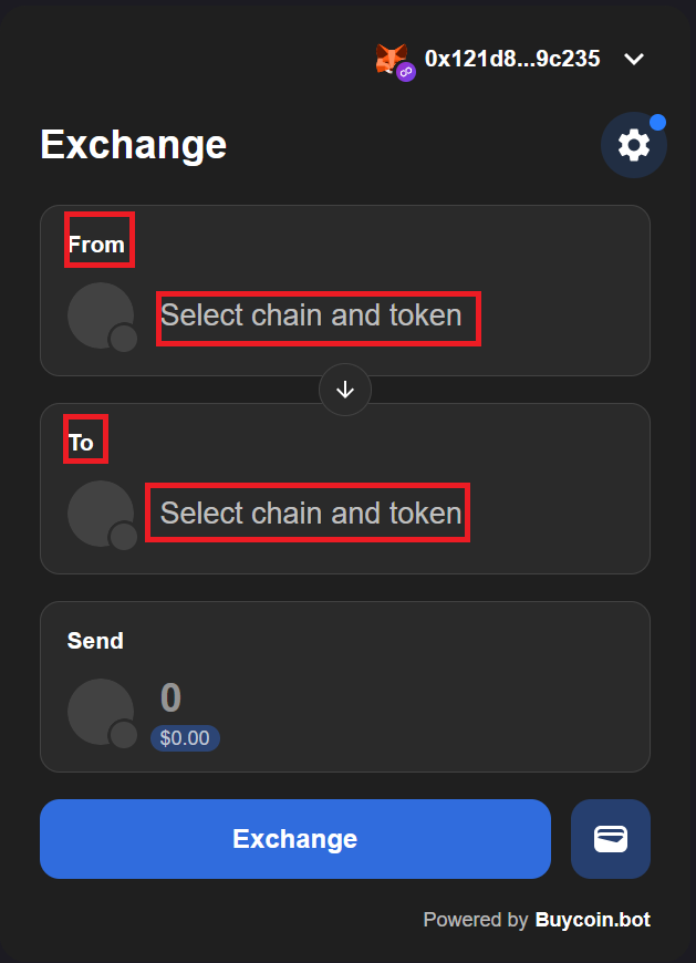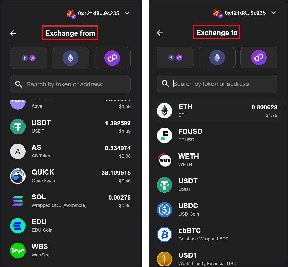 Select Tokens and Blockchains from / to in the token selector "Exchange from" and "Exchange to". To find the token you need, you can search by name or by smart contract address.