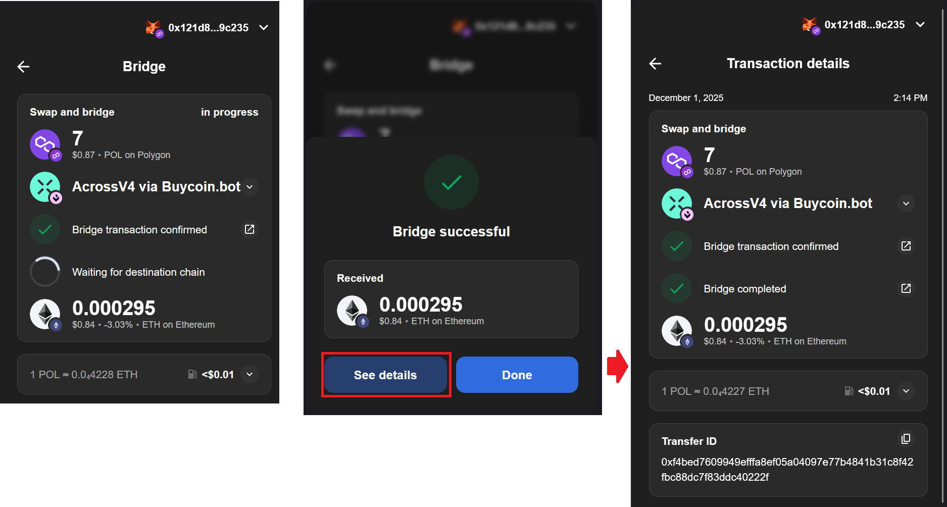 After signing the transaction, you need to wait a few seconds for the transaction to be executed. The progress of the transaction is displayed on the Bridge screen. Once the transaction is complete, you will receive a message confirming that the transaction was successful and you can view the transaction details by clicking on the button.